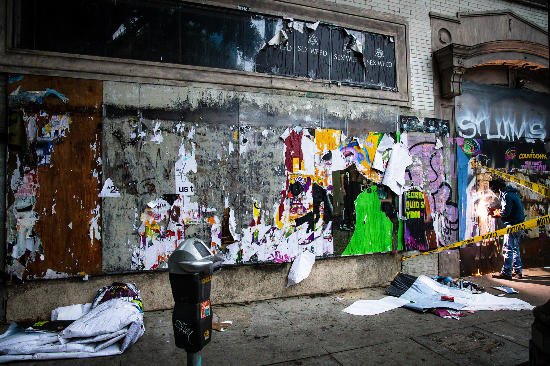 Morrison Hotel in DTLA - Famed hotel window where Henry Diltz photographed The Doors for their album cover of the same name. Welder seen here securing the front doors after fire ripped through the upper floors in 2024.